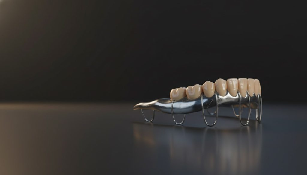 部分入れ歯の場合、残っている歯に金属の針金(クラスプ)を引っかけて固定します。この金属部分が会話中に見えてしまうこともあり、審美性の面では課題があります。