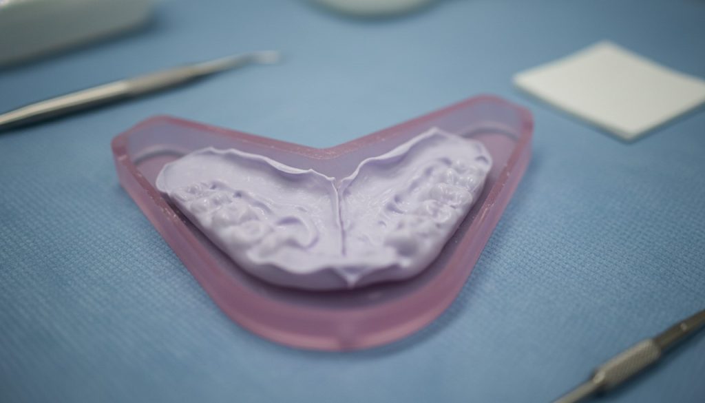 型取り材にも違いがあります。保険診療ではアルジネート印象材が主流ですが、自費診療では変形の少ないシリコン製の印象材を使用することが多く、より正確な型が取れます。