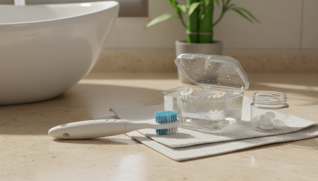 義歯用ブラシでの適切な洗浄、就寝前の義歯洗浄剤の使用、水中での保管という基本的なケアを習慣化することが第一歩です。